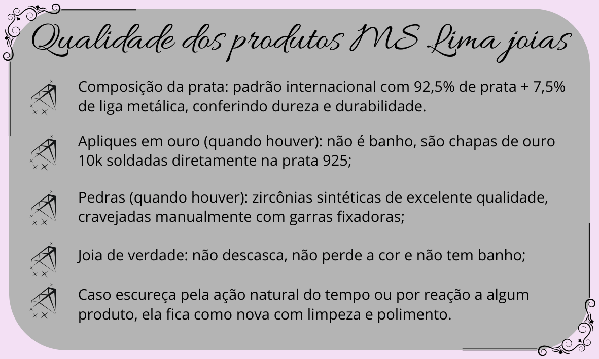 A garantia QUANTO AO TEOR da prata (prata 925) e do ouro (ouro 10k) é vitalícia.